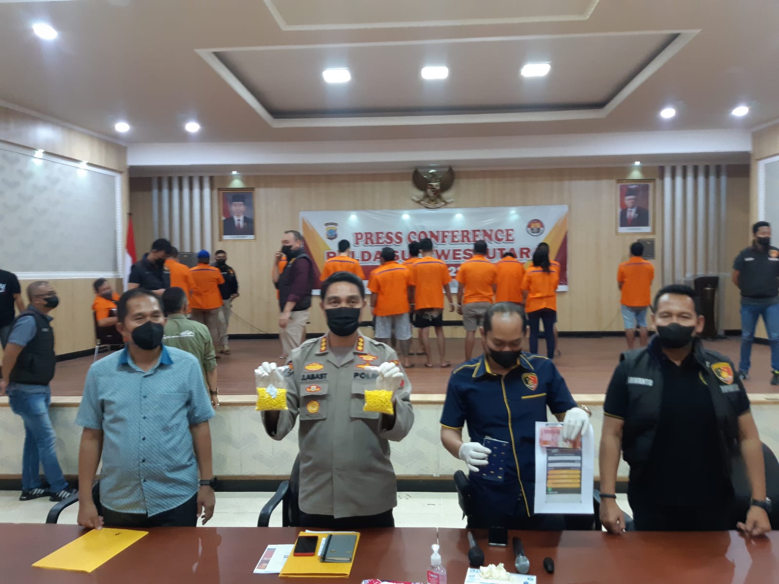 “Barang bukti kasus tindak pidana narkoba antara lain, narkotika jenis sabu seberat sekitar 2,00 gram, obat keras jenis Trihexyphenidyl sebanyak sekitar 15.868 butir, dan miras jenis cap tikus sebanyak sekitar 400 liter,” rinci Kombes Pol Jules Abraham Abast.