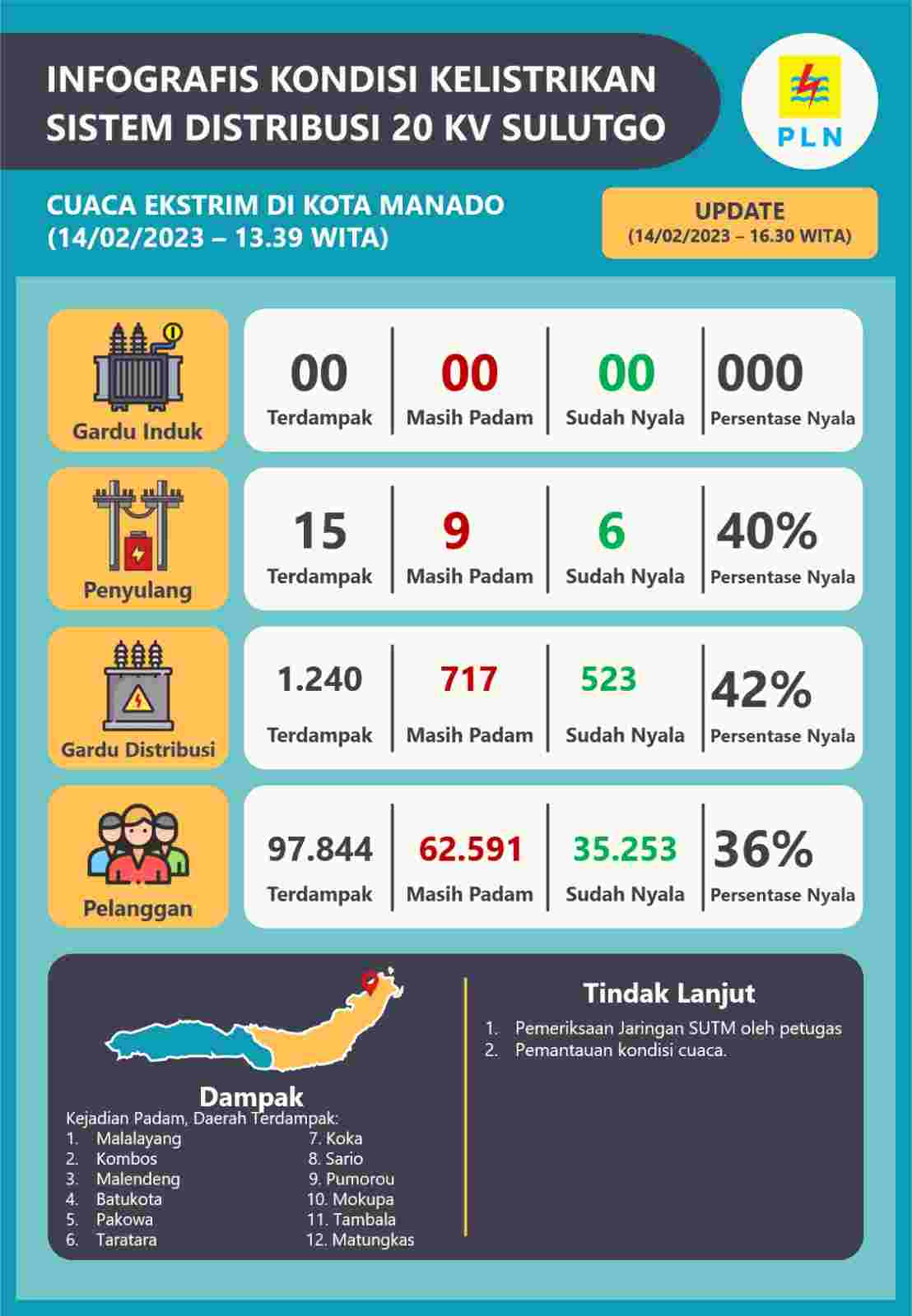 Lpkrinews.id – Manado – PT PLN (Persero) Unit Induk Distribusi Suluttenggo bersama Unit Pelaksana Pelayanan Pelanggan Manado bertindak cepat untuk mengatasi gangguan listrik yang dialami di beberapa daerah yang tersebar di provinsi Sulawesi Utara hari Selasa (14/02) siang.