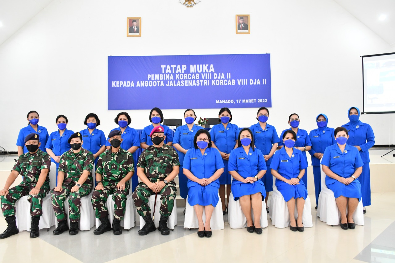 MANADO – LPKRINEWS.ID — Komandan Pangkalan Utama TNI AL (Danlantamal) VIII Manado Brigadir Jenderal TNI (Mar) I Wayan Ariwijaya, S.E., CFrA., selaku pembina Jalasenastri Kordinator Cabang (Korcab) VIII Daerah Jalasenastri Armada (DJA) II, didampingi Ketua Korcab VIII DJA II Ny. Tirta I Wayan Ariwijaya, memberikan pengarahan kepada anggota Jalasenastri Korcab VIII DJA II, melalui tatap muka yang berlangsung di Gedung Yos Sudarso, Mako Lantamal VIII Jl. Yos Sudarso No.1, Kairagi Weru, Paal Dua, Manado, pada hari Kamis (17/3/2022).