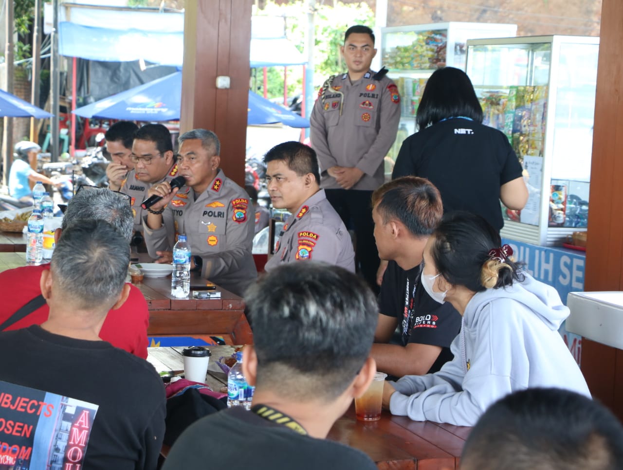 Dalam suasana penuh keakraban, Kapolda Sulut yang turut didampingi Dir Lantas, Kabid Humas, Kapolresta Manado, dan Wadir Binmas, duduk santai bersama dengan berbagai elemen masyarakat sambil berbincang-bincang mengenai informasi maupun keluhan seputar situasi kamtibmas.