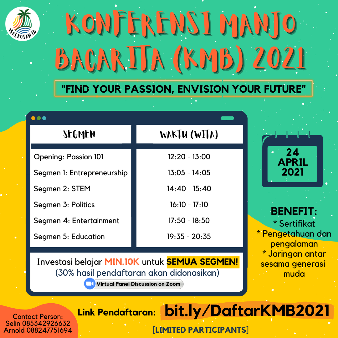 Sebagai informasi, pendaftaran Konferensi Manjo Bacarita 2021 dapat diakses melalui link bit.ly/DaftarKMB2021. Mengingat dengan dibatasinya kontak fisik akibat pandemi yang saat ini kita rasakan, kegiatan KMB 2021 ini bakal digelar melalui media Zoom Meeting.
