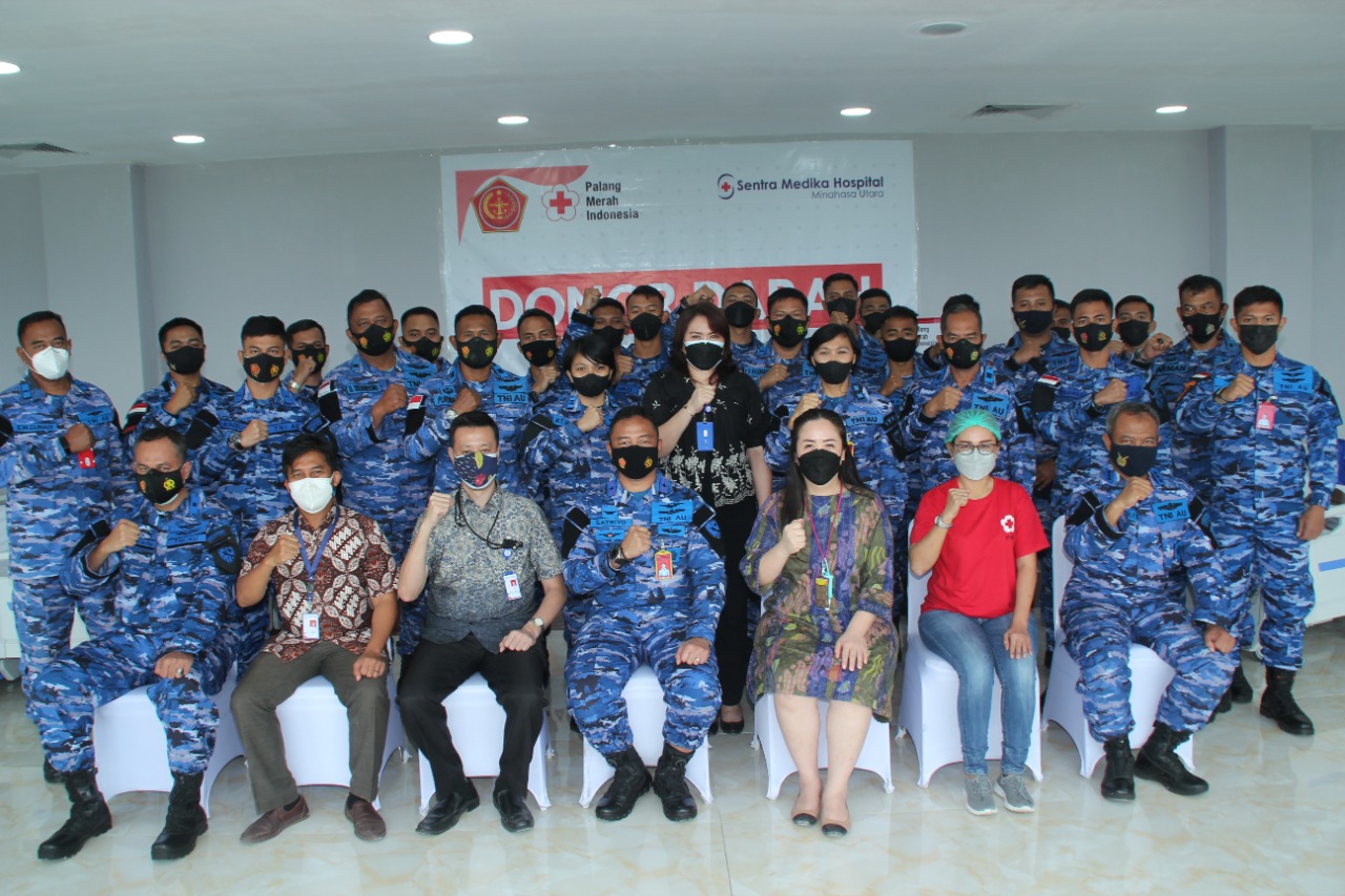 MANADO — LPKRInews.id — Kolaborasi Pangkalan TNI AU Sam Ratulangi dengan RS Sentra Medika Minahasa Utara menghasilkan 119 kantong darah dalam kegiatan Donor Darah di Lantai III Sentra Medika Hospital Minahasa Utara, Sulut, Jumat (17/09/2021).
